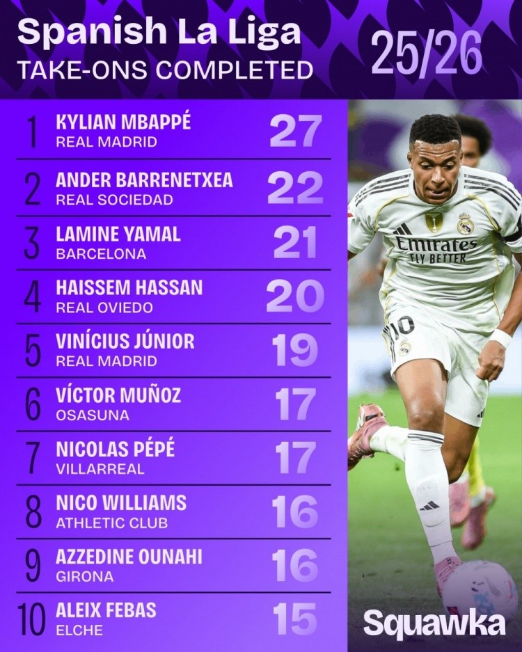 西甲过人次数排行:姆巴佩27次居首 亚马尔第三、维尼修斯第五